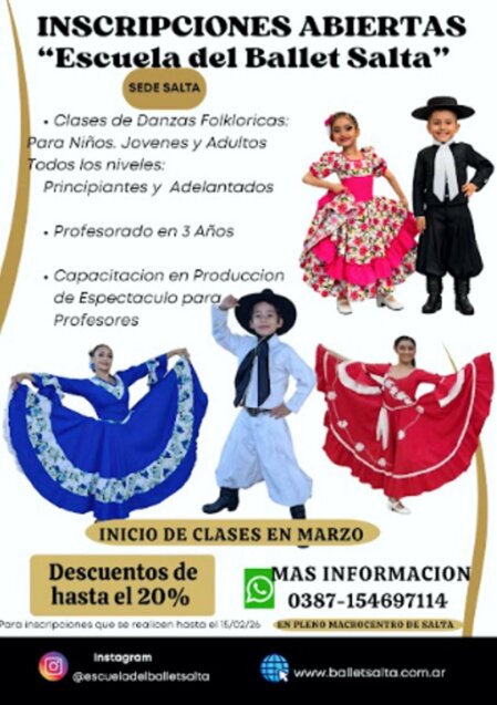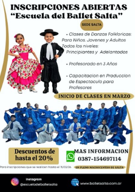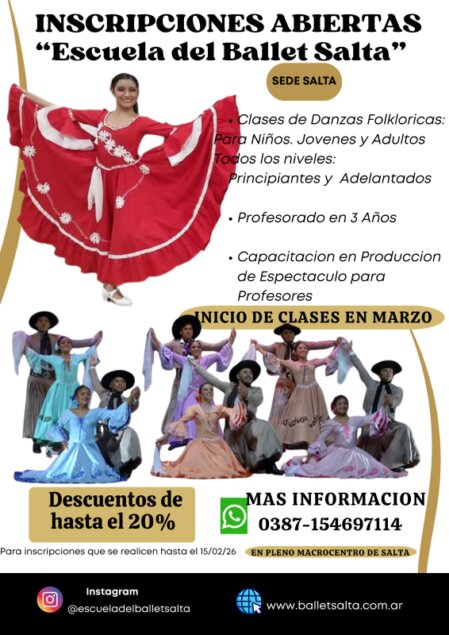 Te recordamos que podés formar parte de la "Escuela de Ballet Salta" y del "Profesorado de Folklore del Ballet Salta 2026" en las Sedes C.A.B.A. y Salta que se desarrollará a partir del mes de Abril del próximo año con una duración de 3 años con las modalidades Presencial y Virtual. No te lo podes perder. Para mayor información y consulta, por los medios consignados al pie de la página y por redes sociales.
